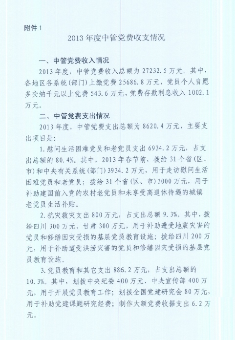 中智公司全體黨員同志們: 根據中組織部、國資委黨建局的指示要求,現將《2013年度中管黨費收支情況》和《2013年度國資委黨委黨費收支情況》于11月5日至11月12日期間進行公示。 請知曉、關注。 中智黨委組織部 2014年11月5日 附件一: